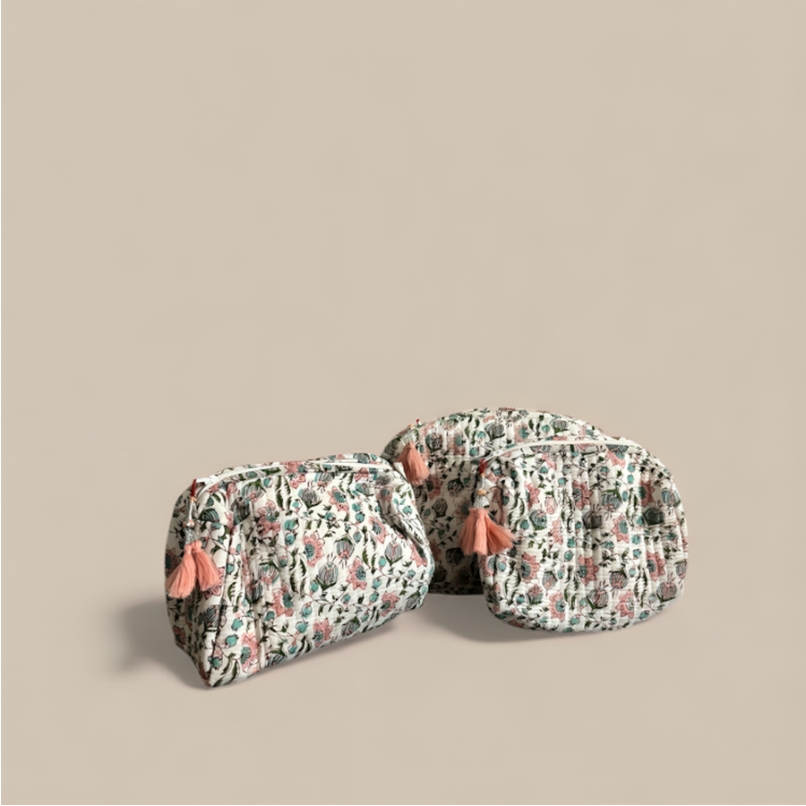This charming pouch is made from 100% cotton and features a unique hand-block print with intricate quilting for added texture and durability, perfect for carrying essentials with style and functionality.