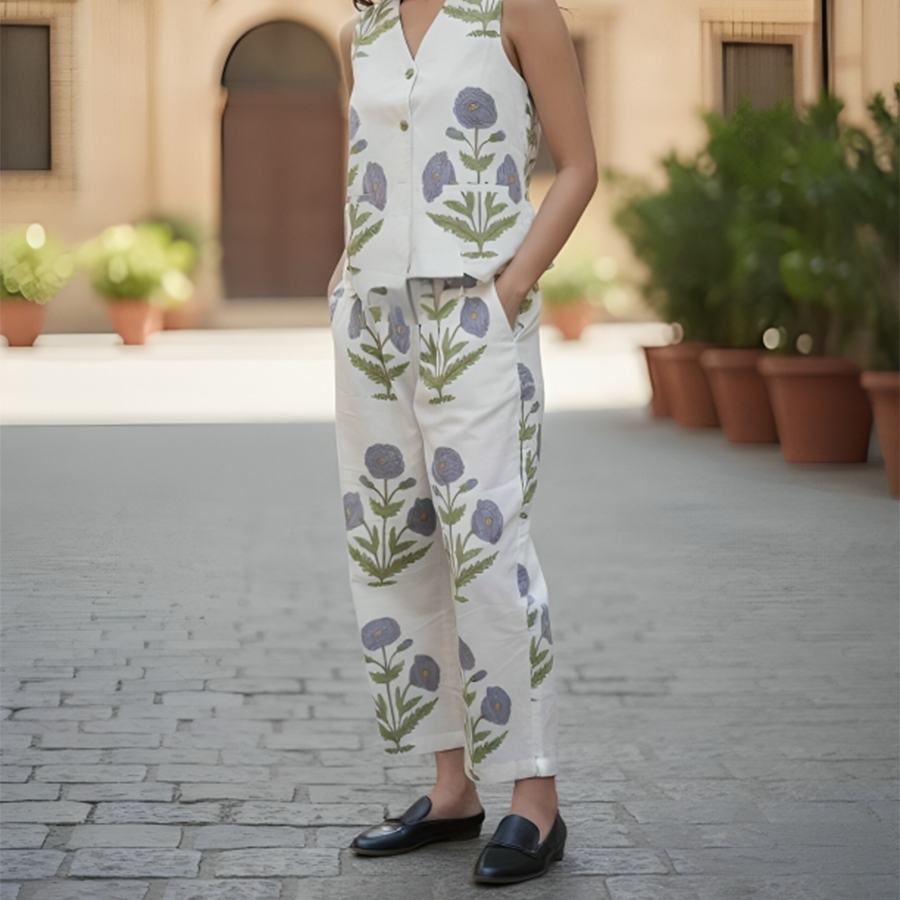 Enhance your look in a classy way with our white silhouette, paired with white trouser. A truly elegant print transformed into an uber chic silhouette of a Waistcoat and Pant Co-ord set. The set is fully lined from underneath.